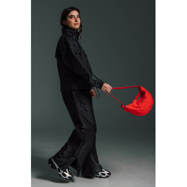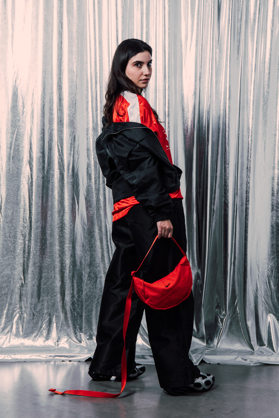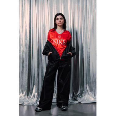 Bluza din aceeași colecție este piesa finală – minimalistă, dar cu o prezență puternică. Este una dintre acele piese care pur și simplu se simt ca fiind ale tale. Pe sub port tricoul clasic cu guler în V, un strat ușor și simplu, un detaliu mic dar important. Iar geanta Nike Aura Crescent Crossbody este accentul final. Compactă, funcțională și exact de dimensiunea potrivită pentru când sunt mereu în mișcare.