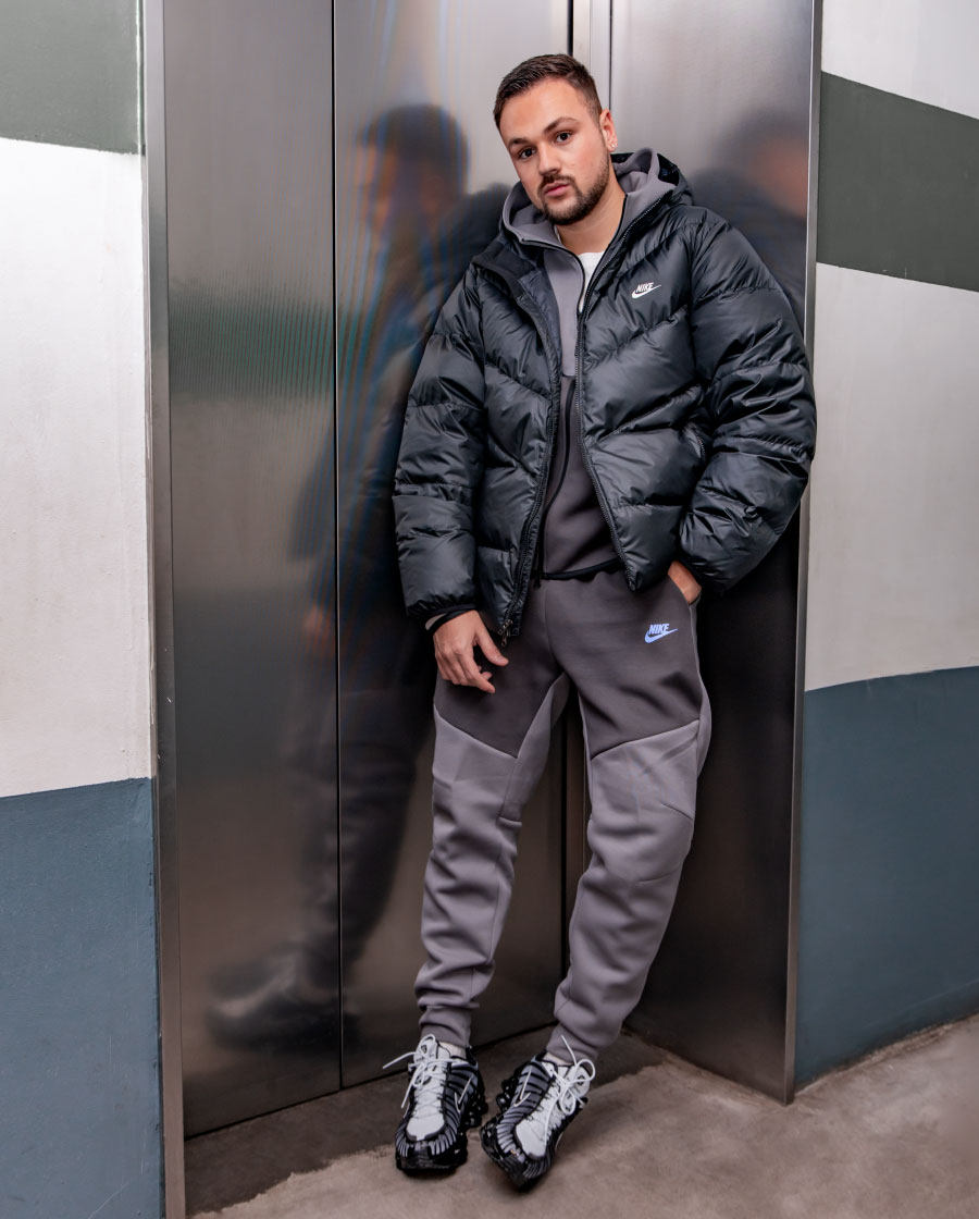 L-am combinat cu piesa virală a sezonului, Nike Tech Fleece, dar nu în varianta clasică. Am ales negru cu gri închis și un accent de albastru, ca să păstrez look-ul clean, dar plin de personalitate. Și, bineînțeles, în zilele reci, hoodie-ul este obligatoriu. Geaca neagră Nike completează perfect outfit-ul și îl face ușor de purtat în orice context.