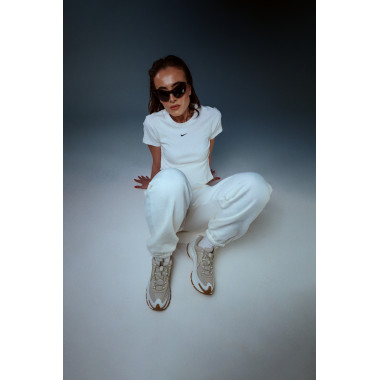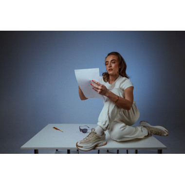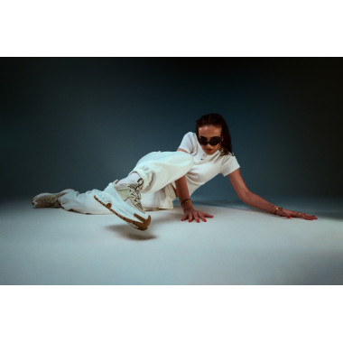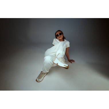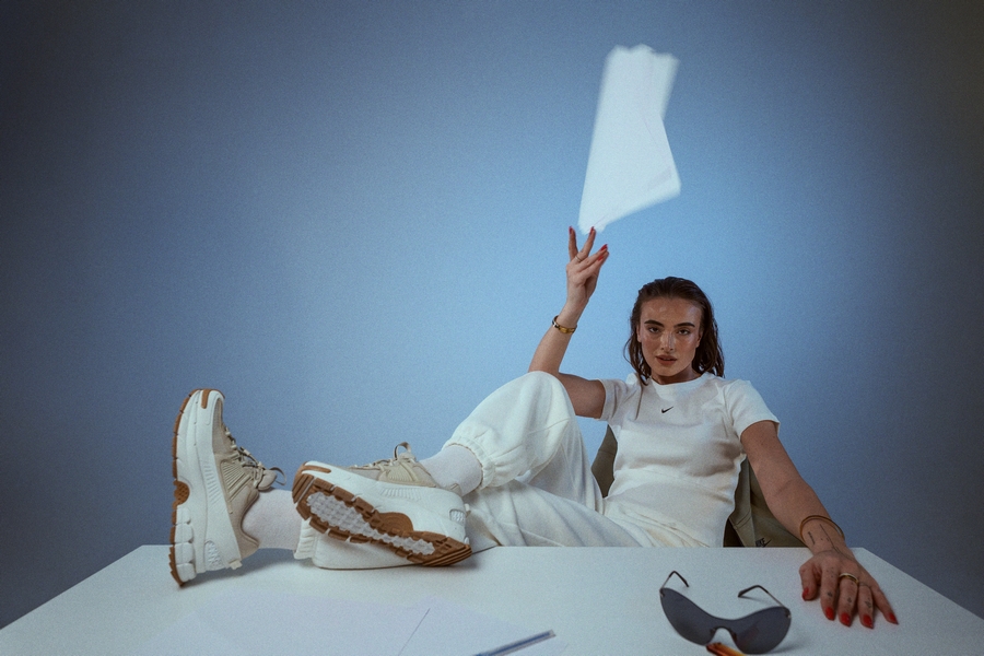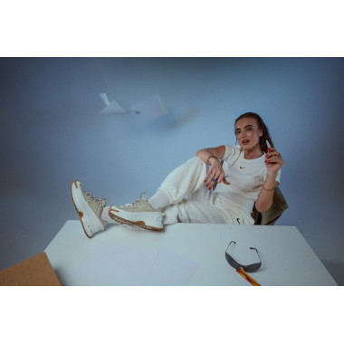 Studioul ne-a oferit libertatea de a ne juca cu pozițiile, lumina și mișcarea. Măsuța nu a fost doar un obiect, ci un contrast — un moment de lucru îmbinat cu energie fashion. Exact aici NIKE ZOOM VOMERO ROAM își arată versatilitatea: trec fără efort de la o zi activă la un look atent stilizat, fără să-și piardă vreodată personalitatea.